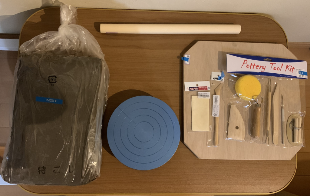 そのほかに買ったのは、手動ろくろ、木の棒(粘土を平にするやつ)、木の板(粘土の作業をする時にしく)、スターターキット(一連の道具が揃っているやつ)、磨く布です。